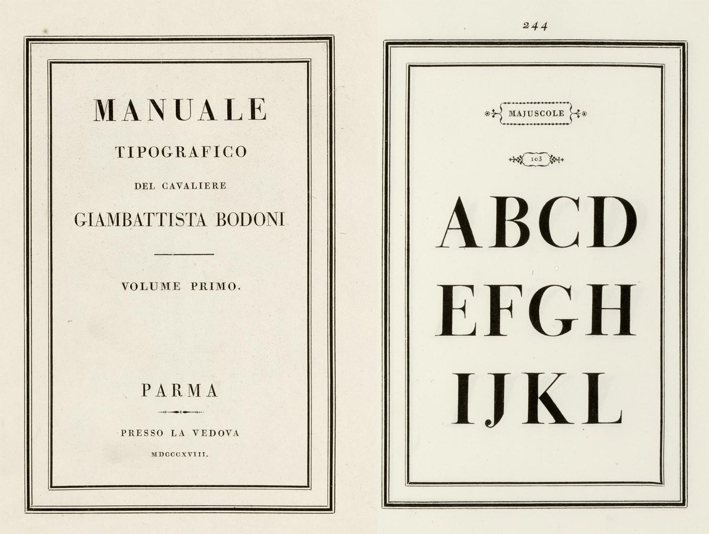 존 바스커빌의 명성과 인쇄기술의 업적들은 이탈리아에도 전해졌다. 보도니가 처음으로 인쇄하기 위해 사용했던 글꼴은 피에르 시몽 푸르니에의 트랜지셔널 활자들이었다. 보도니는 매사에 의욕적이고 무엇이든 빨리 배웠다. 그의 관심사는 장서 제작에 대한 완벽한 구상이었다. 가는 세리프 활자의 펀치를 만들기 위해서는 놀라운 기술이 필요하다. 보도니는 그 모든 과정을 매우 섬세히 수행했다. 이 과정에서 보도니는 만족할 때까지 깎기와 점검을 반복해가며 수개월을 소요하기도 했다. 보도니가 인쇄한 책에는 <호라티우스>와 <베르길리우스>, <카툴루스>, <일리아드>에 이르기까지 위대한 고전 문학이 다수 포함되어 있었다. 1810년에 그는 나폴레옹에게 송아지 피지에 인쇄된 호메로스의 <일리아드>를 선물하기도 했다.
